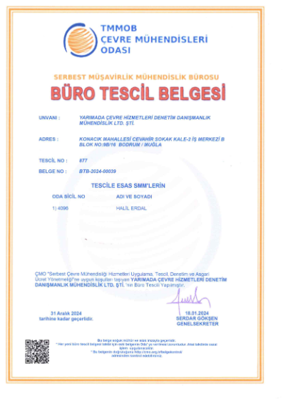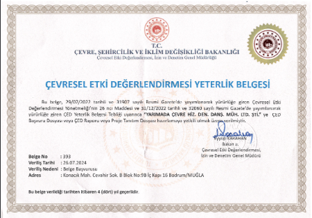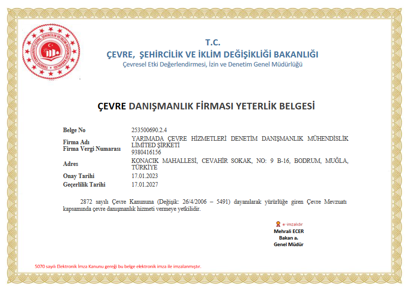 BODRUM/MUĞLA merkezli Çevre Danışmanlık firması olan YARIMADA ÇEVRE HİZMETLERİ DEN. DAN. MUH. LTD.ŞTİ. 11.05.2011 tarihinde T.C. Çevre ve Şehircilik Bakanlığı’ndan “Çevre Danışmanlık Yeterlik”belgesini almış ve deneyimli Çevre Görevlileri ile hizmet vermeye başlamıştır.